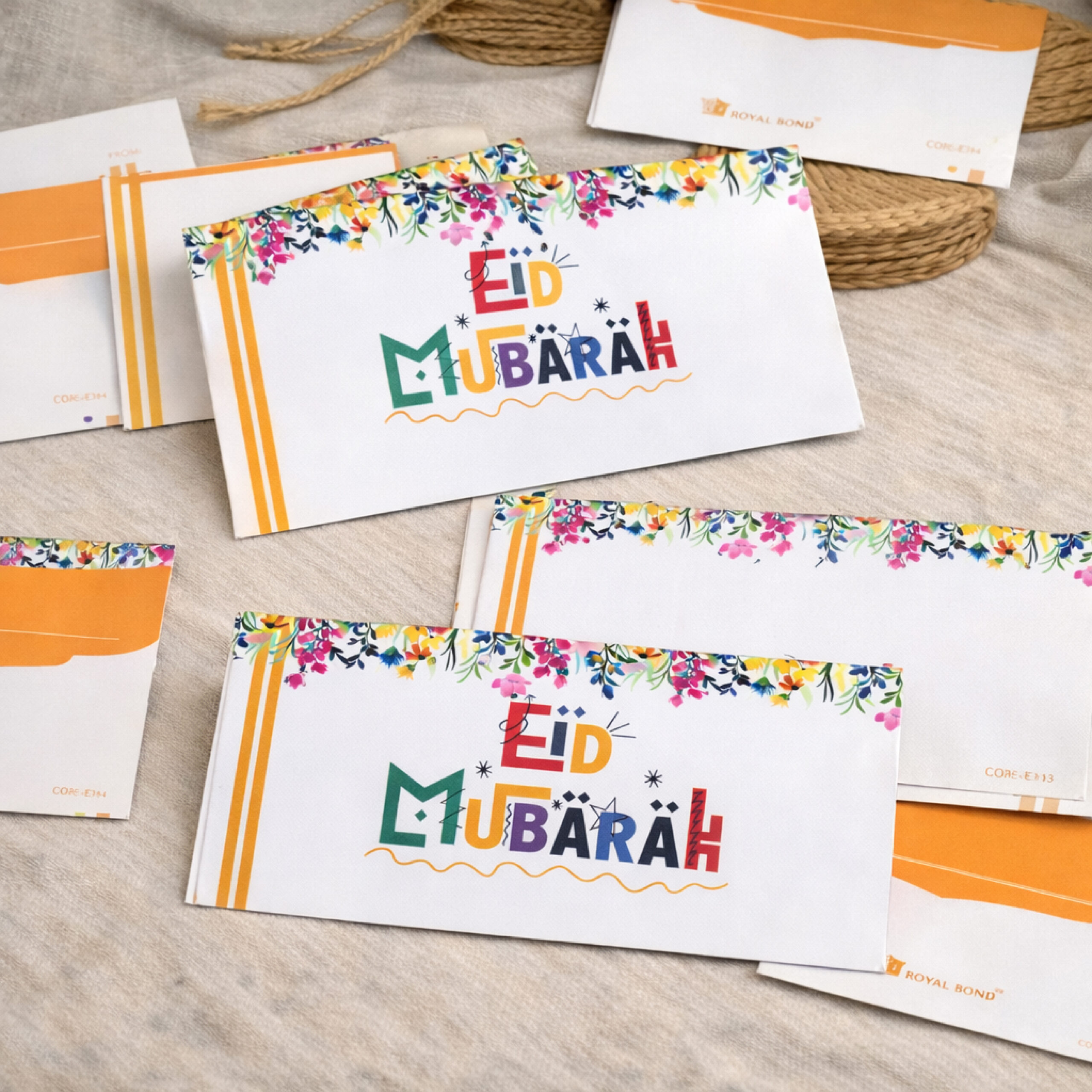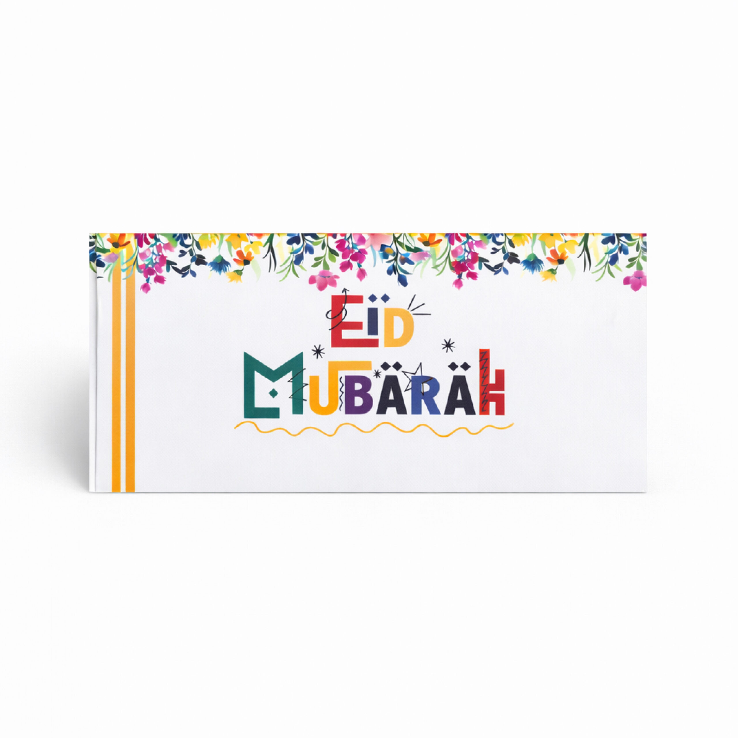 This vibrant and modern Eid Mubarak envelope design is perfect for those who love colorful and artistic gifting. Manufactured using premium sound card material, these envelopes provide excellent strength, a smooth finish, and a high-quality feel. The playful typography and bright floral border make it ideal for festive gifting.