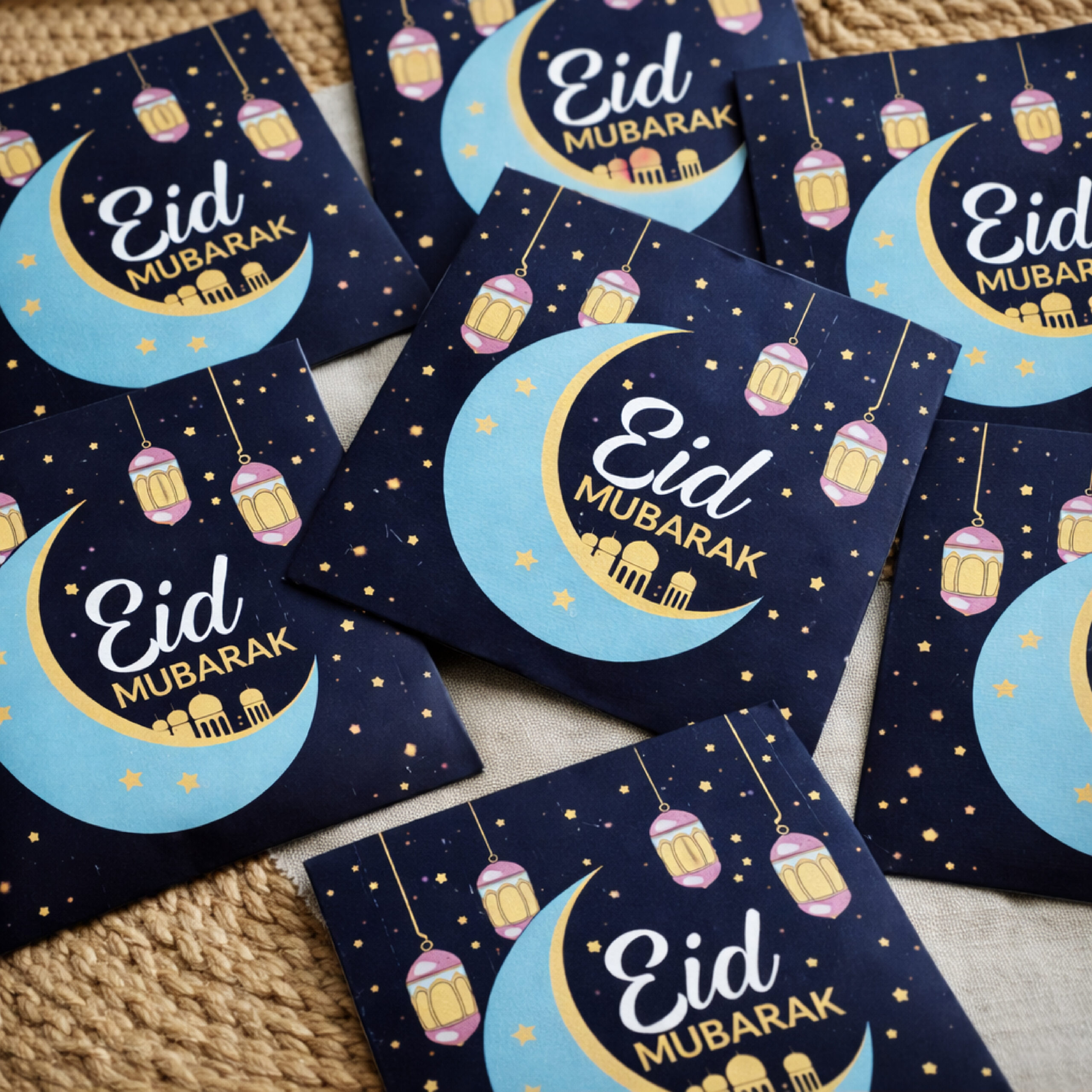 Illuminate your home with this magical night-sky Eid wall art featuring a glowing crescent moon, hanging lanterns, and mosque silhouettes. The deep festive tones create a peaceful and spiritual ambiance, perfect for Ramadan and Eid decoration.