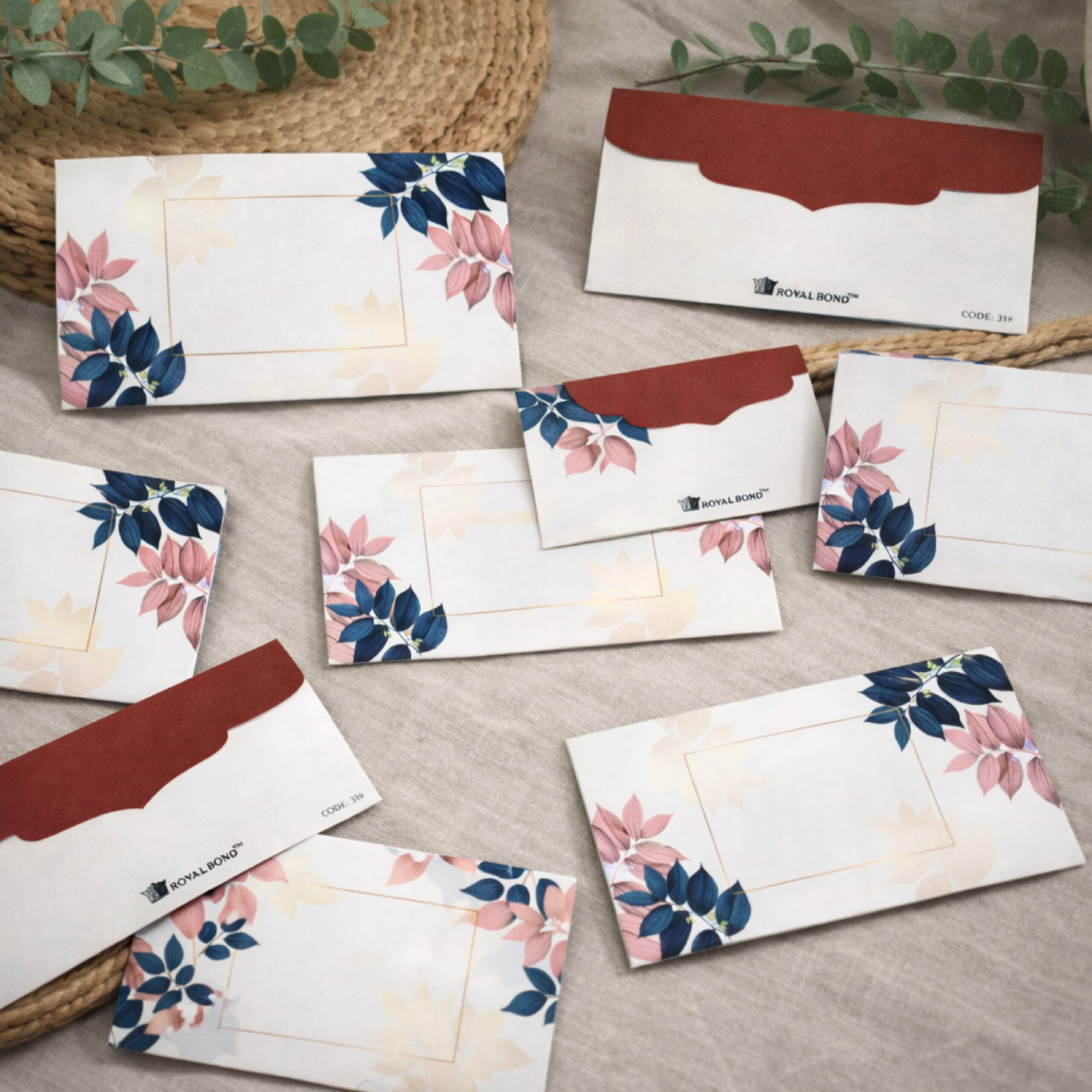 Minimal pastel leaf premium envelope with golden frame. Strong sound card material, elegant design, and ideal for formal invitations. Pack of 10.