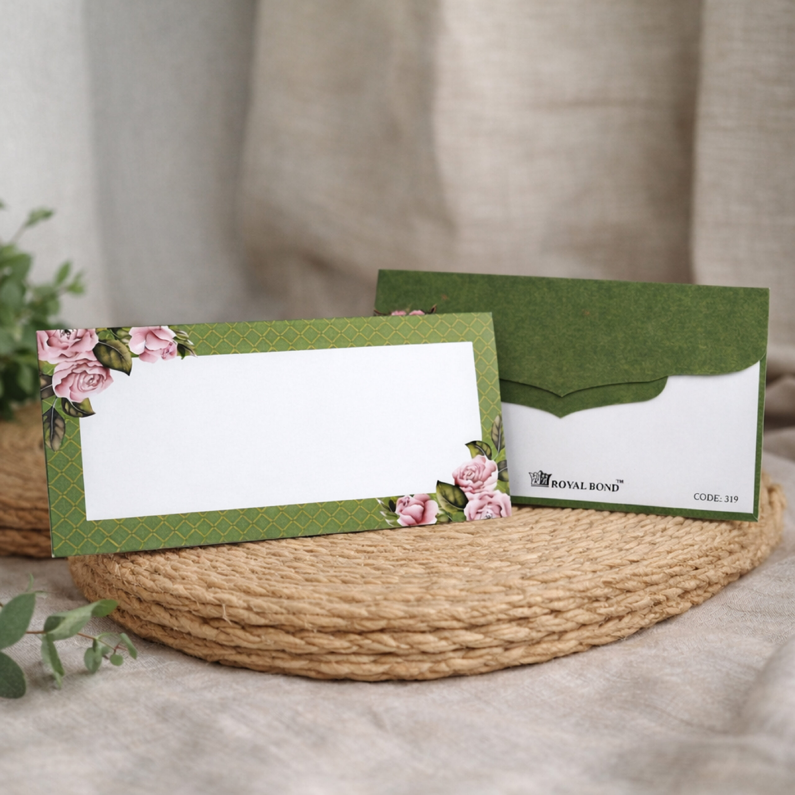 This beautifully designed green floral frame envelope set is a perfect blend of tradition and elegance. Made from superior sound card material, it offers a sturdy and long-lasting structure that stands apart from regular paper envelopes. The soft floral corners with a classic patterned border create a graceful look ideal for weddings, festive gifting, and formal invitations.