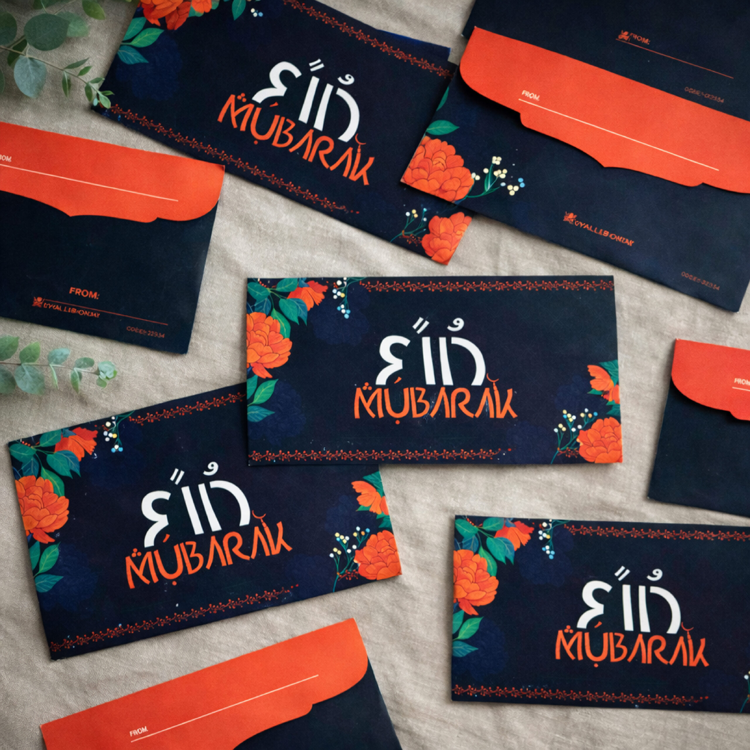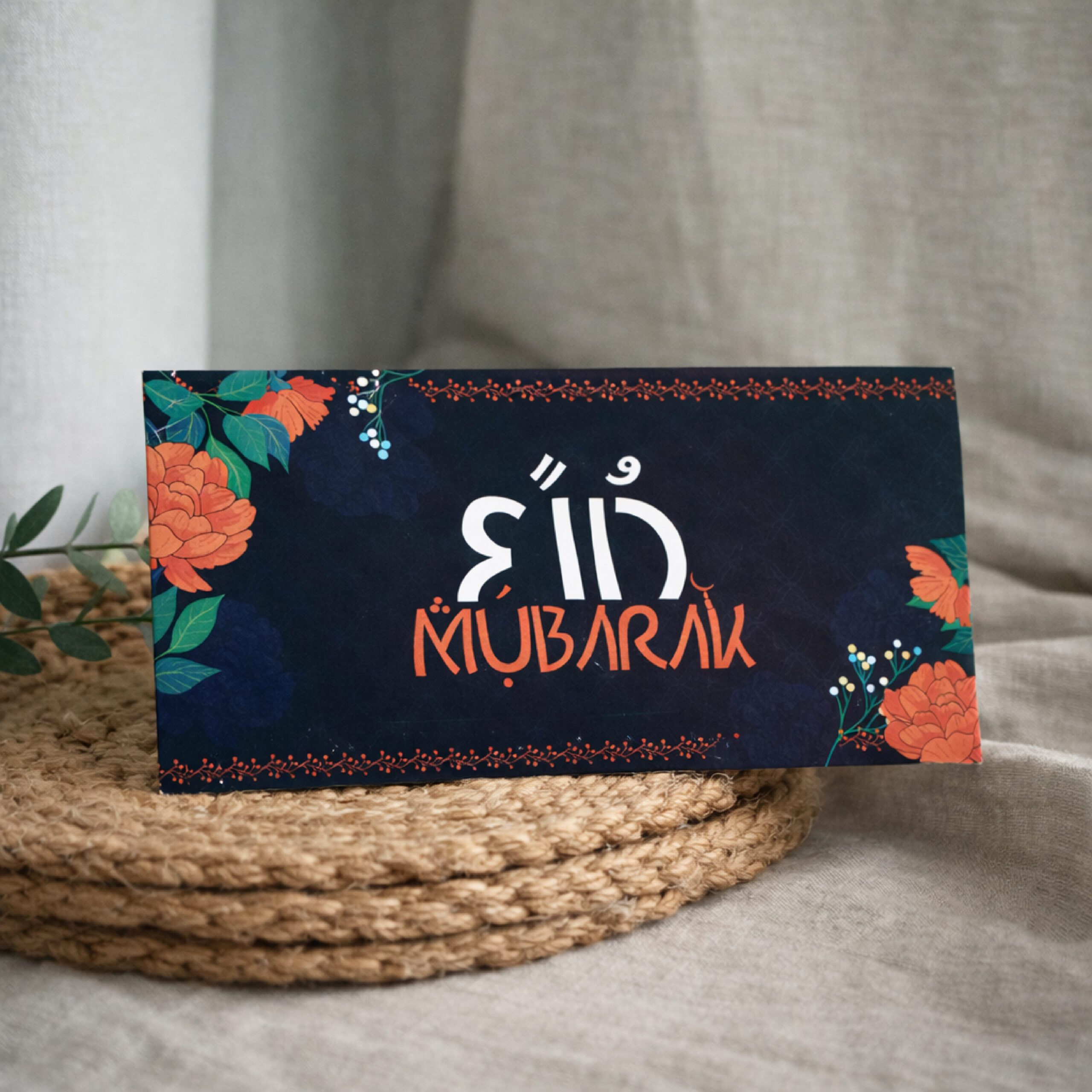 Add a royal touch to your Eid gifting with this navy blue Arabic calligraphy envelope set. Made from thick sound card material, this envelope is not paper – it is a premium card that reflects quality and elegance. The deep blue background with vibrant floral accents and bold Eid Mubarak typography gives it a modern and festive appearance.
